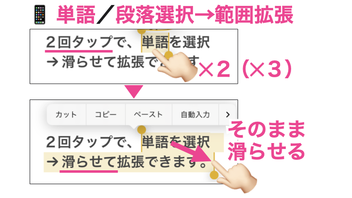 📱iPhone時短術📱iPhone時短術|文字入力:2回タップで単語選択/3回タップで段落選択 it-jitan 2025年3月22日 ✅2回タップで単語選択 ✅3回タップで段落選択→そのまま指を離さず範囲拡張可能💻Macでもクリックで同様